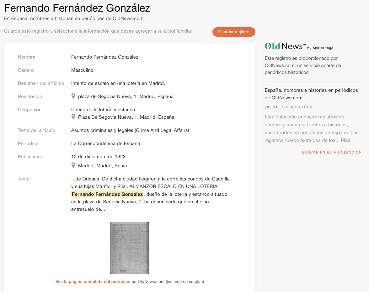 Puedes buscar en la colección España, nombres e historias en periódicos de forma gratuita en MyHeritage. Para ver todos los detalles de los registros se requiere una suscripción de Datos, Complete u Omni.