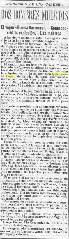 Otro ejemplo de la nueva colección, hallado en la publicación El Noroeste con fecha de 21 de diciembre de 1906, cuenta la historia de Jesús Alonso López, fogonero a bordo del vapor de pesca Blanca Barreras, con base en Vigo.